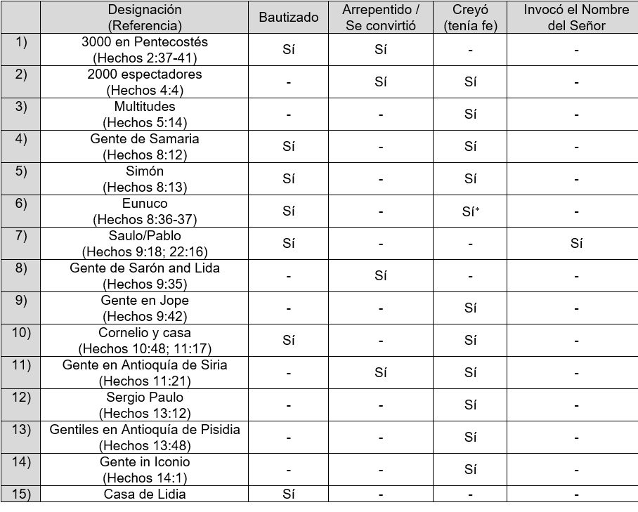 El libro de Hechos cuenta muchas conversiones. Algunas tienen algún grado de detalle. Otras son solamente una mención sin detalles. Lo que vemos es el conjunto de condiciones mencionadas por Lucas. Ninguna aparece en todas las instancias. Tampoco menciona todas las condiciones en ningún contexto. El hecho de que en Hechos 2:38 y contexto no menciona fe/creencia no implica que no tenían fe. El hecho de que en Hechos 5:14 no menciona arrepentimiento no indica que no lo tenían. El hecho de que en Hechos 9:42 no menciona bautismo ni indica que no lo hicieron. Fe, arrepentimiento y bautismo son condiciones para salvación. Aquí dejo un resumen de cada ejemplo en Hechos.