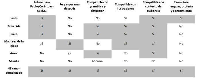 Llegando al grano de lo que hay que ver, en v. 10 sale la palabra que será clave para entender cuando cesarán las lenguas, la profecía, y el conocimiento. La Cosa Completa (telion): Telion tiene tres traducciones posibles (dependiendo del significado): la cosa completa, la cosa perfecta, o la cosa madura. La cuestión de ¿qué es la telion? es muy importante. La respuesta se puede establecer de dos formas, la positiva (sección a) y la negativa (sección b), la cuales son las siguientes: A. Pablo contrasta la telion con cosas parciales, entonces el significado de “la cosa completa” debe ser entendido. No está hablando de la perfección como muchos lo entienden, más bien es parte del contraste con cosas incompletas. Si el contraste es entre la cosa completa y las cosas parciales, podemos esperar que la cosa completa sería otra forma de las cosas parciales. Las cosas parciales son los dones revelatorios las cuales estaban causando problemas en la iglesia de Corinto. Esperamos, entonces, que la “cosa completa” será algo revelatorio. Además, la cosa completa tiene que ser algo no presente en el tiempo en que Pablo escribió eso y antes de la Segunda Venida de Cristo. Considerando todo eso, el Nuevo Testamento ciertamente parece caber. B. ¿Y qué de otros significados posibles de telion? La idea más común es que se refiere a la Segunda Venida de Cristo. La evidencia principal para este entendimiento es la terminología en las ilustraciones. “Entonces veremos cara a cara” y “entonces conoceré plenamente.” Primero, “cara a cara” en una ilustración no hace necesario un encuentro personal con Jesús para entenderla. El contraste principal en la ilustración es entre un espejo oscuro y la habilidad de ver claramente. “Cara a cara” describe como es ver claramente. Un espejo de la época de Pablo no parecía mirar a alguien “cara a cara.” Segundo, “conoceré plenamente” es una traducción dudable de la palabra griega epiginosko. La palabra griega muchas veces se usaba como sinónimo para ginosko, “conocer, saber” – normalmente los dos verbos son intercambiables en el NT, y en los otros casos epiginosko refiere a conocer real o verdaderamente.  Además, aún en el Cielo no seremos omniscientes. Nunca podemos, como seres finitos, poseer conocimiento pleno de todo (aunque puede ser que conoceremos mucho más que ahora). Más importante que eso, es el hecho que Pablo dice que la fe, la esperanza, y el amor permanecerán después de la venida de la telion. Pablo dice que el mayor de ellos es el amor, porque el amor “nunca deja de ser.” Pero, es Pablo que nos enseña en Romanos 8:24 que no esperamos lo que vemos sino lo que no tenemos. La esperanza tiene que ver con la anticipación del cumplimiento futuro de promesas buenas. Así que, en el Cielo no habrá necesidad de la esperanza. De la misma manera, fe se trata de confianza en lo que no vemos (2 Cor 5:7). En la segunda venida, nuestra fe se convertirá en vista. La Segunda Venida de Cristo no es el entendimiento mejor de la telion. Otra opción que muchos citan es “el amor.” El problema mayor con esta interpretación es que el amor ya estaba presente en el tiempo de Pablo. Pablo indica que la telion era algo futuro. Otros dicen que Cristo es “la cosa perfecta” (y por eso, quieren decir Jesús) pero esta interpretación es completamente contra la gramática griega. La palabra telion es neutro, mientras Jesús es masculino. Además, si “Jesús” fuera la “cosa completa” sería otra vez referencia a la Segunda Venida con los problemas de esa interpretación. Hay otros que dicen que la “cosa completa” es la muerte. Esa interpretación es muy rara y obviamente errónea. La telion es algo futuro y la muerte ya había estado pasando mucho rato. Si es la muerte del individuo, tiene los problemas de que la fe y la esperanza siguen después. La otra opción dada es entender la telion como “madurez” de la iglesia o del individuo. Aunque esta interpretación sí viene de un significado posible de telion y parece caber con una de las ilustraciones, tiene problemas grandes. No toma en consideración el contraste (incompleto con completo) y que debe estar reemplazando los dones revelatorios. También hay otras consideraciones con esta interpretación: Los apóstoles practicaban estos dones, ¿acaso que no eran maduros ellos? ¿O, en cual punto de madurar nos quita Dios los dones o se los quita de la iglesia? Podemos concluir, entonces, que la interpretación mejor de la telion es el Nuevo Testamento. Cabe bien con el contexto y ciertamente mejor que los alternativos. Para visualizar mejor estas ideas, véase lo siguiente:
